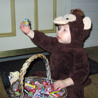 Our little man (my grandson) also dressed as an animal. At 16 months, he's too young to have candy. But, when he spotted my candy basket, he plopped himself right down on the doormat and pulled the basket over so he could begin examining it. Here is our Little Monkey, as he holds a piece of candy aloft to more fully admire its beauty.