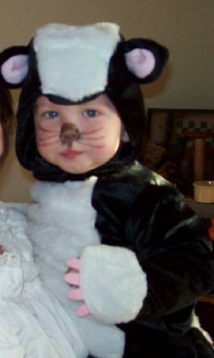 I know that I'm behind on this thread but things have finally settled down for me to spend some time on the board. We had just moved to Texas when Halloween came around. So I think we were only at our new home two days before the holiday. Anyhow, we dressed our little man up as a skunk, the hubby actually dressed up this year as Ron Burgundy in "Anchor Man", and I wore the same outfit I did last year. We had a great night and Danny finally got to go trick-or-treating. He loved it and came back with a bag full of goodies. So here's some pics of Daniel and myself. Hope everyone else had a good night.