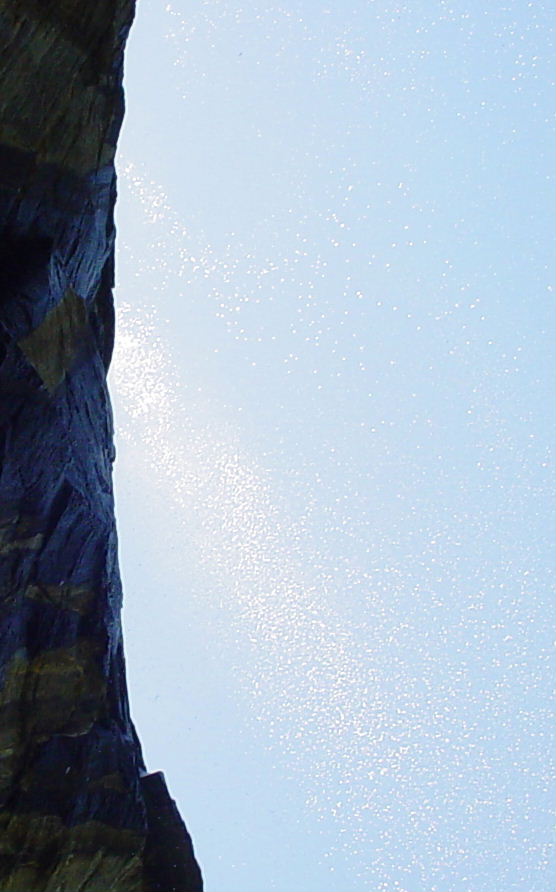 | Actually, UL13, that isn't rain. It's the water coming from Nature's Shower Bath off the top of the mountain. Had the priveledge of getting a bit wet by it at this year's Gathering....and if you are there at the right time of day, you get the sun shining on it from behind and it looks like diamonds falling out of the sky...absolutely breathtaking. |
