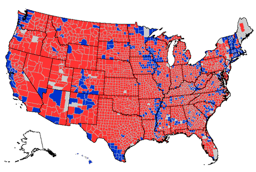 Those are some interesting stats, but if we take a walk over to the map, and see how each county in the U.S. voted, you would have a little different set of numbers: